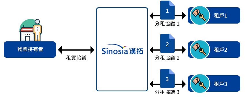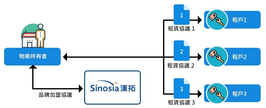 業務模式 | 物業持有者加盟漢拓成為租賃管理服務品牌加盟商,利用漢拓的專業品牌形象為項目推廣招商。漢拓會協助加盟商快速建立品牌商業模式和籌建專業化服務團隊 |